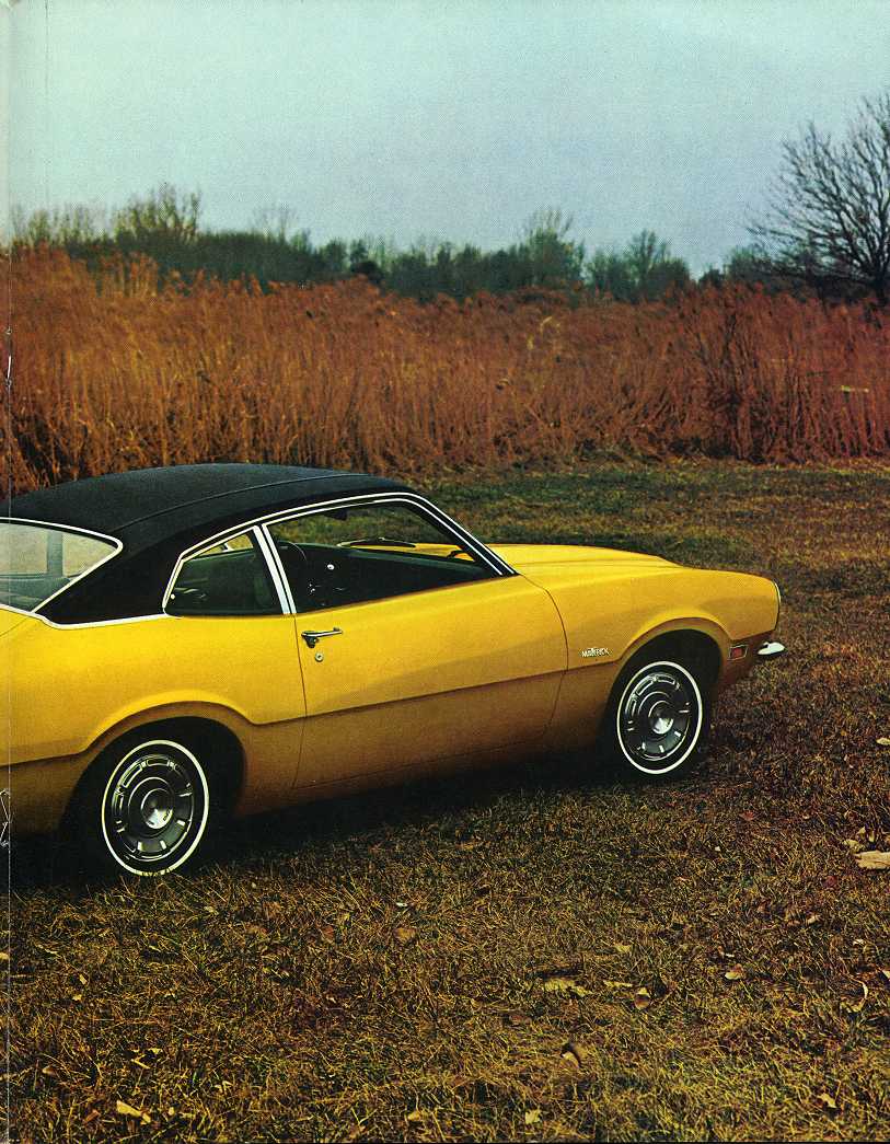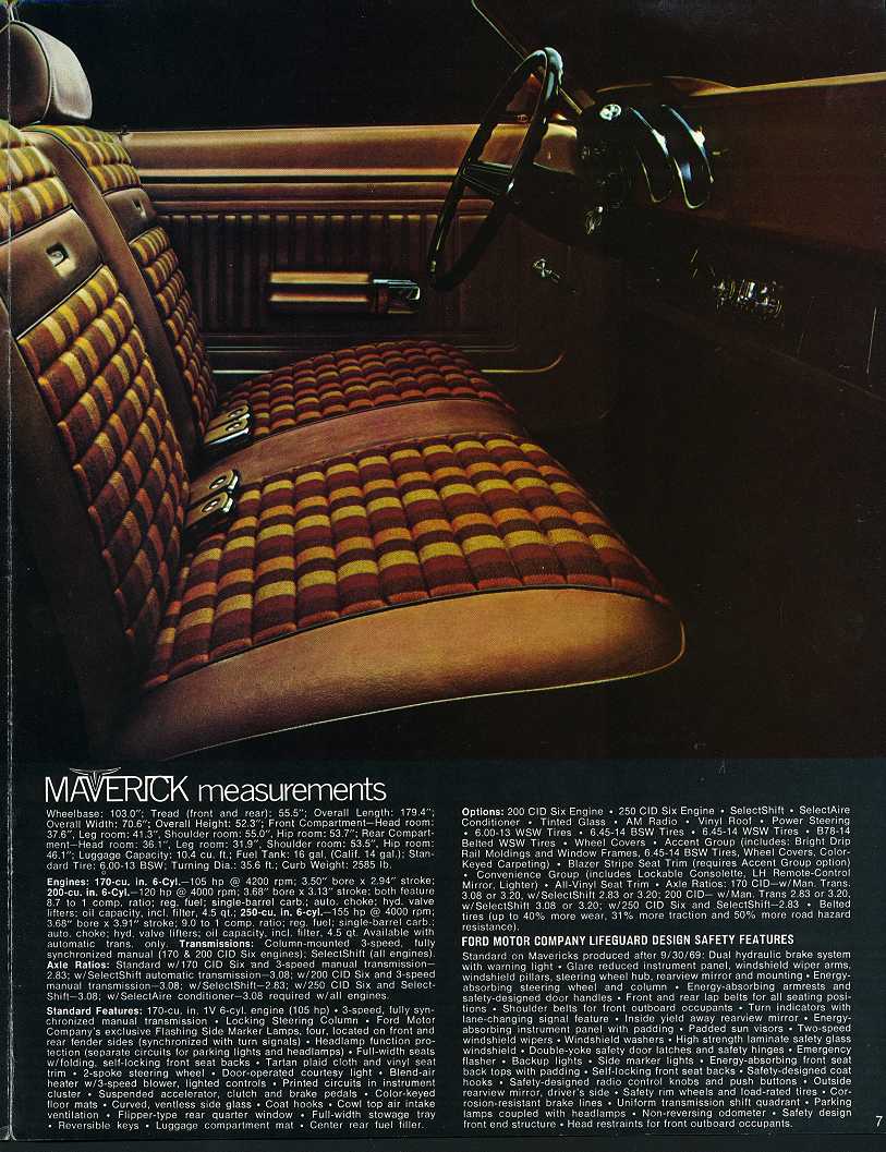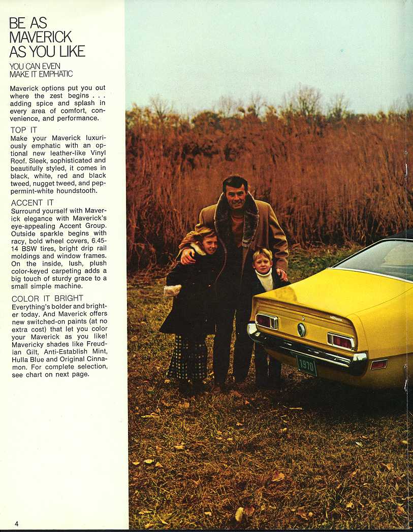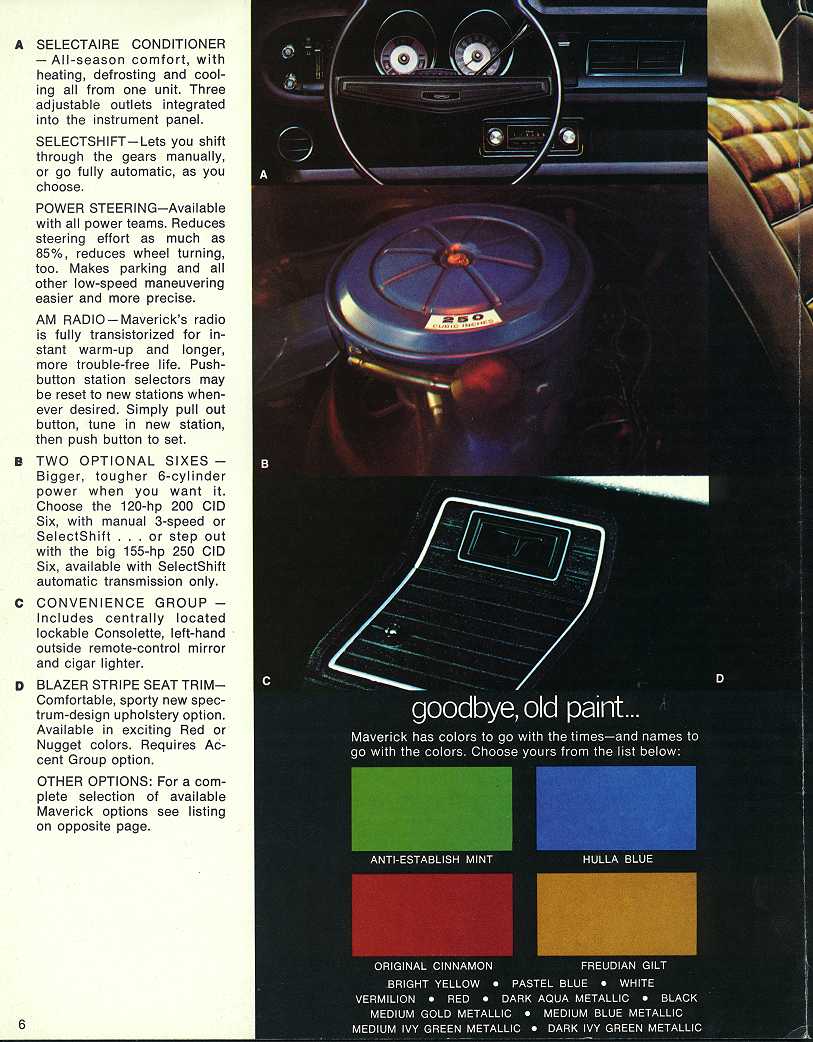 1/70: By this time, the brochure has changed significantly.  The three-panel/fold out design has been deleted, and is now replaced with 4-page stapled brochure (8 pages in total).  The cover photo is the same, but everything else differs.  A yellow car with a full black vinyl roof appears on page 4 and 5 (featuring the larger 14" rims and wheel covers, and white wall tires).  The "Maverick" script on the front fenders now appears in a lower position than it appears in either of the preceding 1970-model year brochures.  On page 6, options appear in illustration form for the first time: A/C is featured, the 250 six appears for the first time, the center console is illustrated, the Blazer seat trim is mentioned, and is the Convenience Group (including the center console, left-hand outside remote-controlled mirror and cigar (not cigarette !) lighter.  On page 7, the Blazer seat trim in earth tones appears in a large illustration.  The Options list on page 7 has also grown to include new items: "Belted" tires (radials?) in the size of B78-14 White sidewall, and vinyl roof.  The final page (page 8) has a basic promotional and mechanical details on the car.