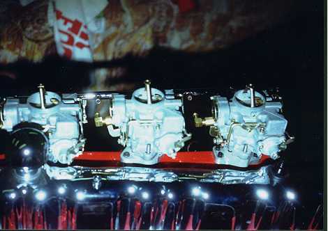 started to take the car apart, I took the engine to master mechanic Mike Smith along with a trunk full of parts from Clifford Engineering. He was given the mission of installing tri-power and making it work! With the help of master machinist Cedric Ozminski ("Ozzie"), magic was worked! First, the short block was bored .030 with 9-to-1 Jahns pistons installed. The rods were shot-peened, polished, mounted to the pistons and crank and then the entire assembly was balanced. Meanwhile, the head was ported and polished and extrude honed, and the front and rear of the integral intake portion of the head were opened up to permit mounting the carbs, the exhaust ports were hogged out to match the headers, a port divider between the third and fourth cylinders was heli-arced in, custom aluminum car mounting pads were machined by Ozzie, a custom fuel log was constructed, a fuel pump block off plate was machined and mounted (the car has an electric fuel pump), Ozzie made a custom air cleaner along with a Maverick-monogramed throttle bracket and more additional details that can be listed here.
