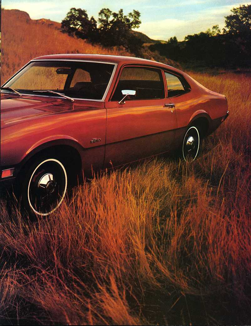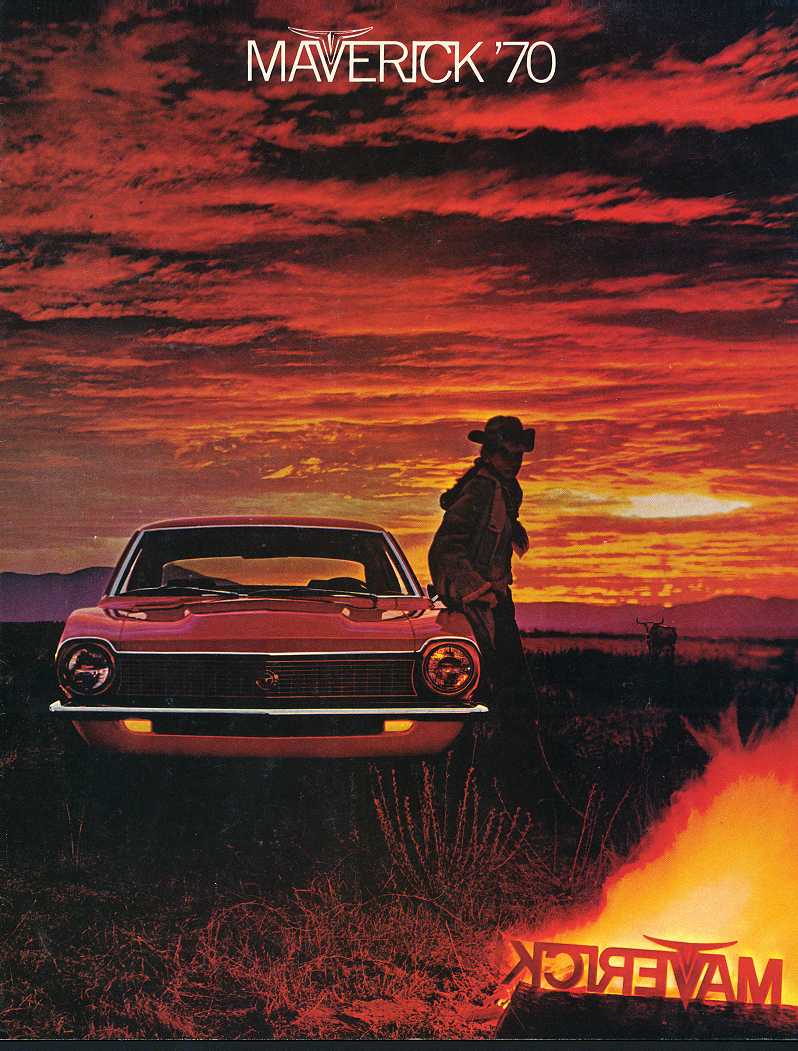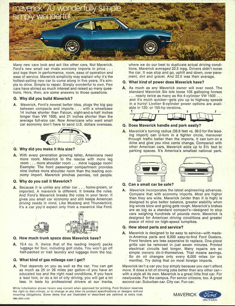 1/70: By this time, the brochure has changed significantly.  The three-panel/fold out design has been deleted, and is now replaced with 4-page stapled brochure (8 pages in total).  The cover photo is the same, but everything else differs.  A yellow car with a full black vinyl roof appears on page 4 and 5 (featuring the larger 14" rims and wheel covers, and white wall tires).  The "Maverick" script on the front fenders now appears in a lower position than it appears in either of the preceding 1970-model year brochures.  On page 6, options appear in illustration form for the first time: A/C is featured, the 250 six appears for the first time, the center console is illustrated, the Blazer seat trim is mentioned, and is the Convenience Group (including the center console, left-hand outside remote-controlled mirror and cigar (not cigarette !) lighter.  On page 7, the Blazer seat trim in earth tones appears in a large illustration.  The Options list on page 7 has also grown to include new items: "Belted" tires (radials?) in the size of B78-14 White sidewall, and vinyl roof.  The final page (page 8) has a basic promotional and mechanical details on the car.
